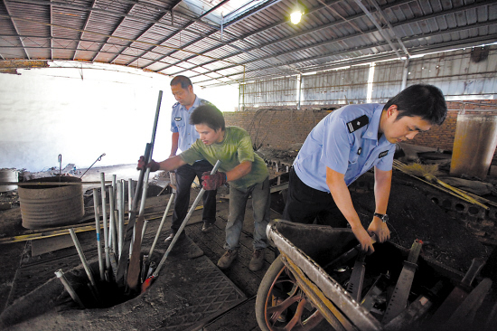 昨天,仙居县下各镇的一处金属加工厂,民警与工人正往熔炉里塞收缴的管制刀具。当天,全国公安机关集中销毁非法枪暴物品活动台州现场在此启动,共销毁了在今年“缴刀缉枪治暴”专项行动中收缴的管制刀具4万多把,各类枪支33支。 记者 潘侃俊 摄