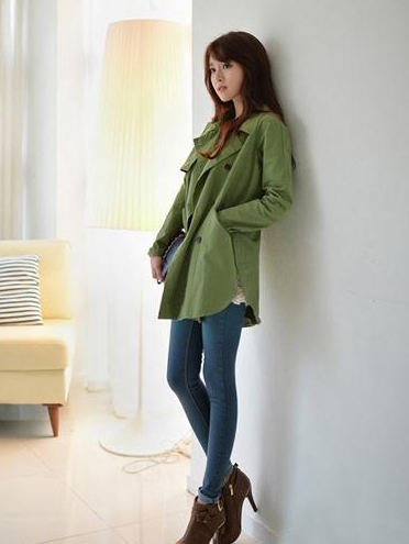 军绿色风衣外套是很多韩剧女主角很喜欢用的,帅气的颜色加上简约的剪裁让女人变的更有风味。铅笔裤与短靴组合起来,下半身看起来足够纤细,这样风衣就不会让你看起来矮胖矮胖的。