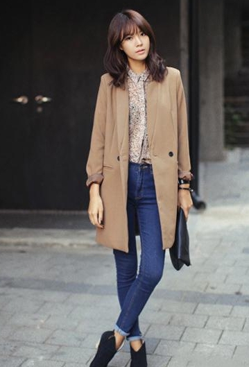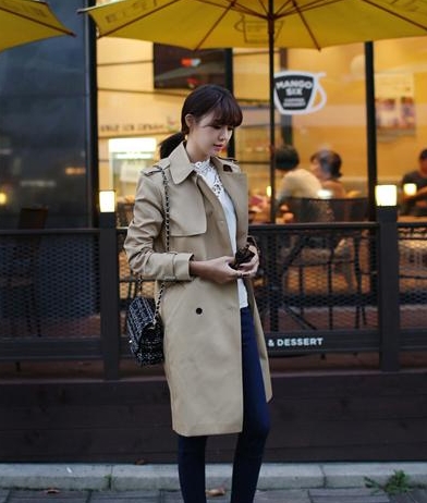 卡其色的风衣外套在秋季来说选择频率最高,因为不挑肤色,且易于搭配。对于矮胖女生要抓住的重点是先显瘦,再增高,否则看起来就没有那么和谐了。这里可以用到长袖T恤搭配高腰牛仔裤,把身材比例重新组合一下,再用风衣罩在外面,这样风衣就起来一个修长的视觉效果。