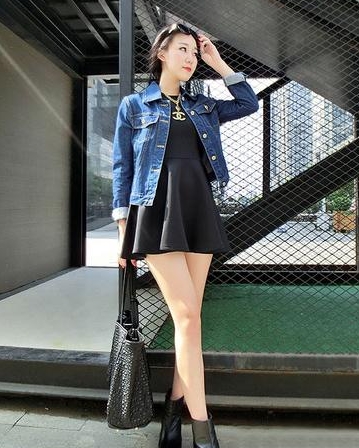 黑色连衣裙是一年四季最百搭的单品,单穿可以小性感,内搭可以很气质。在秋季,建议微胖女生一定要有这样一条连衣裙,它有瘦身的效果,还衬肤色。此时利用比较硬朗材质的牛仔外套会让肩膀的肉肉隐形起来,瞬间焦点就会放在裙子上面。