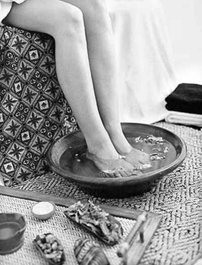 泡脚时可以在水里加些祛寒的药物,厨房里常见的花椒就是一种很好的祛寒药。花椒性温,在中药里属于祛寒类药物,能除五脏六腑之寒,且能通血脉,调关节。先抓一把花椒加入适量水煎熬,待药物充分融入水中时倒入盆中先熏双脚,等水凉到能下脚时用来泡脚。在这个过程中可以不断加入热花椒水,水以盖过脚踝为好,泡上半小时,以全身微微冒汗为宜。因为,出汗是祛寒的最好方法。除了花椒,艾叶祛寒除湿的效果也不错。