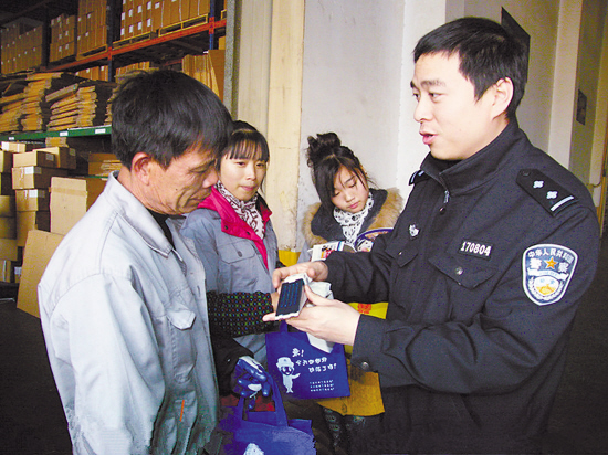 12月24日,椒江公安分局的社区民警带着精心准备的年底“防范大礼包”,深入辖区企业、厂矿、学校和居民家中免费发放,一个上午就发放各种家防盗报警器100多个、防范宣传手册300余本。图为社区民警在一家企业发放“防范大礼包”,并为员工讲解如何正确使用防盗门塞报警器。葛培兴摄