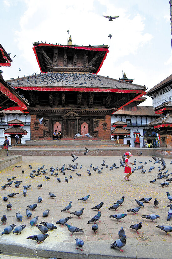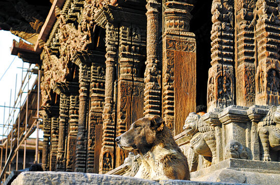 到了杜巴广场,你会发觉,这是一座活着的、一直在生长的古城。这里囊括了尼泊尔16到19世纪之间的古迹建筑,包括了加德满都名字来源的Hanuman老皇宫,以性爱雕塑图案闻名的Shiva-Parvati神庙,活女神库玛丽住的Kumari Baha,都有着华美的木雕窗户,繁复的红色砖雕,以及原石垒就的塔基。孩子们穿着英式校服在其间奔跑玩闹,闲来无趣的男人们会坐在那些被风吹日晒了数百年的寺廊下发呆沉思,妇女们用古老相传的陶罐子接水,流浪狗卧在那些精美的木雕佛像边,鸽子停驻在重檐翘壁上……常有尼泊尔人坐在庙前的石阶上闲聊,或售卖当地手工艺品,与他们讨价还价也是一种乐趣。