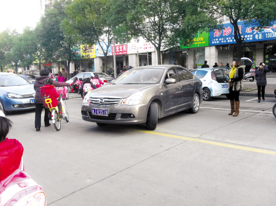 16时10分,一辆私家车从西往东行驶,随后停在了校门口附近。过了5分钟左右,一名学生背着书包直接走向私家车。随后,私家车驾驶员启动车子,准备掉头。车子横亘在道路中间,一下子占据了两个车道,来往的车辆不得不停下,让其先掉头。