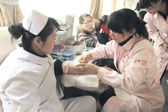 1月17日,在临海市中医院,医护人员正在献血。当日,临海市中医院数十名医护人员参加了义务献血。据了解,这是该院第五次组织医护人员义务献血。 记者李昌正摄