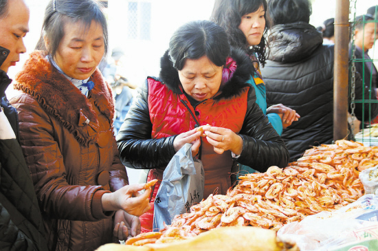 昨日,玉环城关街头的鱼货摊前围满了新玉环人。虾干、乌贼干等玉环特色鱼干成了新玉环人回乡的特色礼品。