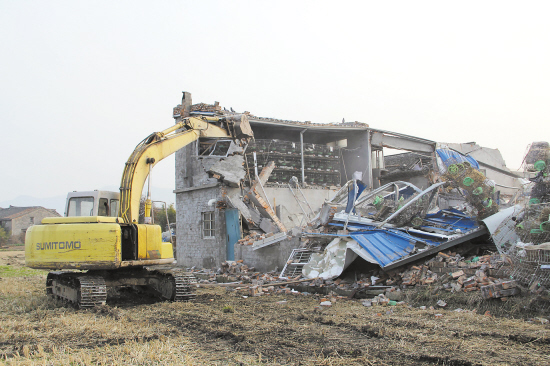 1月18日下午,在一台大型机械车辆的强力推动下,温岭市松门镇八甲村的一养鸽场终于被强制拆下了。据了解,该养鸽场违法建筑面积达300多平方米,拖了两个多月仍然没有拆。