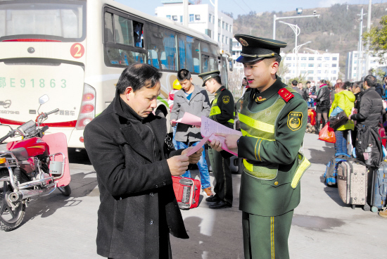 临近春节,车站、商场等地成为人流集聚地。1月23日,玉环大麦屿边防派出所组织官兵深入玉环各车站、商场等地,通过发放宣传单向广大市民详细讲解防盗、防诈骗等安全防范知识和乘车安全注意事项,引导市民提高安全防范意识,过一个平安和谐的春节。图为边防官兵正在为旅客讲解安全防范知识。 通讯员 王能