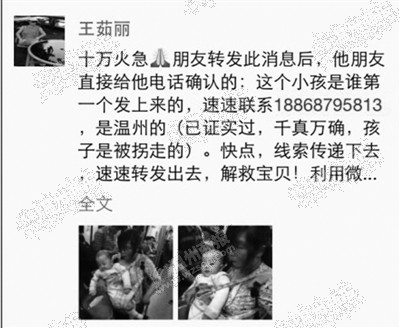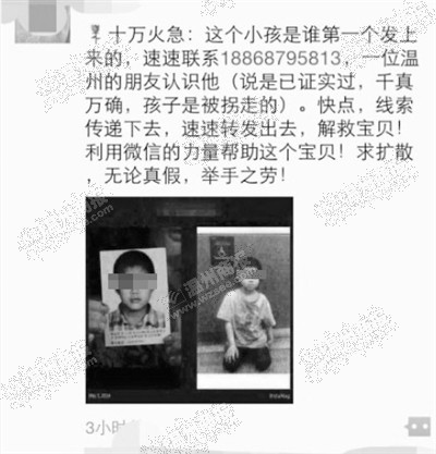 这几日,很多人的微信微博都会出现这样的防拐信息:一个穿着黄衣服的小孩跪在地下通道地面上,很配合地看着镜头,微信里说孩子是温州人,然后留下一个电话号码18868795813;一襁褓婴儿被一妇女抱着,在北京地铁里乞讨,微信里也说孩子是温州人,是被拐走的,也留下一个18868795813的电话号码。此外,还有一个据说在某个开发区走丢的小女孩,留下一个名叫“郑春蓉”的联系人电话13969597919。这些信息在被转发的同时,几乎都有“朋友已经确认”或“速速转发,利用微信力量解救孩子,功德无量”这类的话。