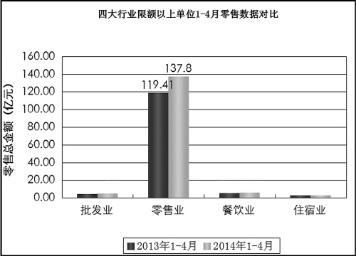 从这四个行业来看,批发、零售和餐饮业的限额以上零售额增速比一季度都有所提高。这三个行业1-4月的零售额分别为5.33亿元、137.80亿元、6.19亿元,与去年同期相比也分别增长了8.4%、15.4%、6.8%。而住宿业的零售额为3.23亿元,与去年同期相比下降5.2%。