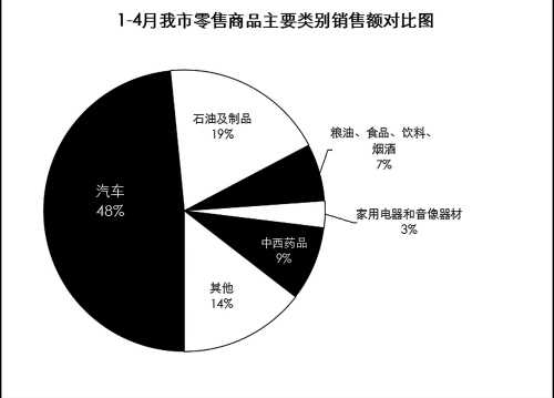 从五大类主要商品零售额来看,1-4月,汽车类,石油及制品类,粮油、食品、饮料、烟酒类,家用电器和音像器材类,中西药品类的零售额分别为73.88亿元、28.76亿元、10.04亿元、4.68亿元、13.03亿元。