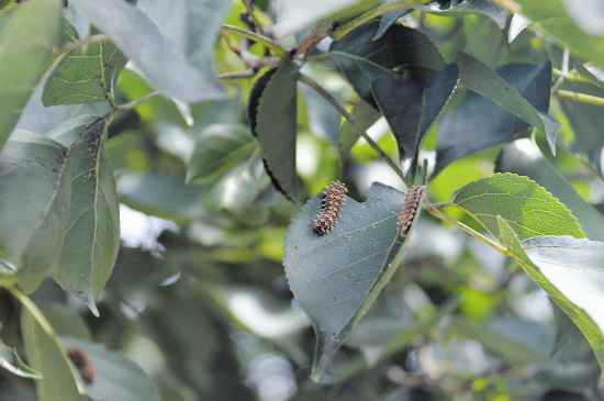 在这棵大树底下,记者发现几条正在爬行的毛毛虫。这种虫子呈灰黑色,体长在2厘米左右,虫子的背面长着一排排肉刺,肉刺中间还有黑色的小斑点。