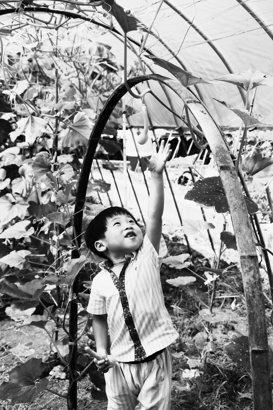一名小朋友在蔬菜采摘区想要摘迷你瓜。