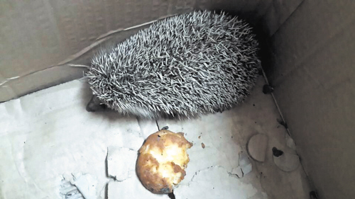 昨天下午,市民方先生双手托着一只大纸板箱走进了晚报热线部。让小Q大吃一惊的是,里面居然是一只小刺猬。刺猬有10多公分长,9公分左右宽,嘴巴尖尖的,身上满是灰白色的长刺。小刺猬卷成一团,缩在纸板箱的角落里,只是偶尔把头伸出来看看,基本上是一动不动。