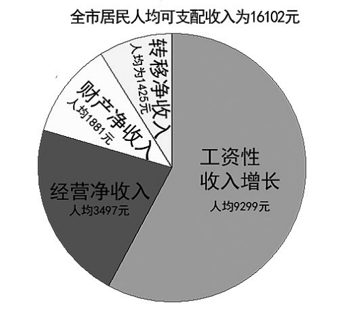这其中,工资对全市居民可支配收入的贡献占大头,稳占第一增收第一宝座,人均为9299元,占可支配收入的比重达57.8%,比去年同期增长10.9%,对可支配收入增长的贡献率达64.6%。
