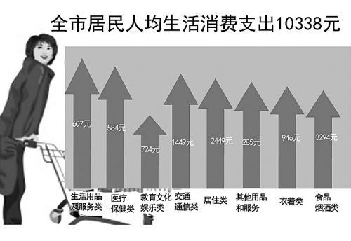 上半年,全市居民人均生活消费支出10338元,比上年同期增长10.8%,扣除价格因素的影响,实际增长7.2%。其中,城镇常住居民人均生活消费支出12670元,农村常住居民人均生活消费支出7911元。