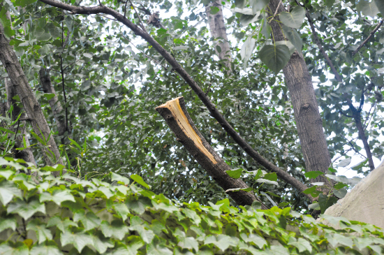 昨天下午,记者来到位于开发大道上的康乐缘老人公寓,公寓里住着几十位老人。循着老人所指的方向,记者来到了公寓东边的围墙边上,折断的树枝已经被锯了下来,搬离了现场。