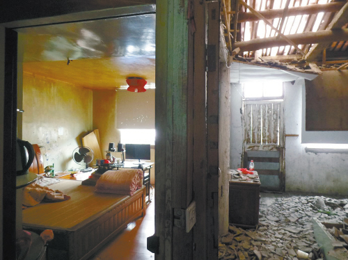 一幢两间两层的旧屋,是村民赵万友与儿子的安身之所。走到二楼,外侧一间的屋顶却已倒塌,光靠一片塑料篷布遮风挡雨,吊顶和椽柱都已塌下,地上一片瓦砾,而这间废墟的隔壁,就是赵万友与儿子的卧室。一名村民叹道:“要是刮台风,这房子怕是抵不住。”
