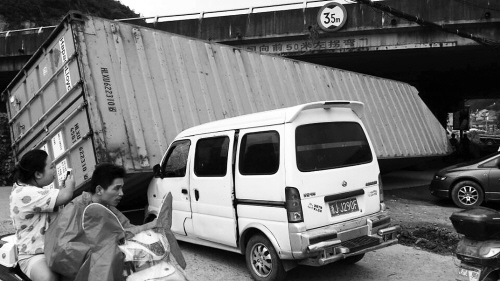 昨天下午2点左右,在温岭大溪镇沙岸村附近,一辆装有集装箱的半挂车在通过高速公路桥时被卡住。集装箱在巨大的外力作用下,脱离车身向一侧倒下,刚好压到从此经过的一辆银白色面包车。所幸的是,面包车司机只受了轻微外伤,并无生命之忧。 记者王媛媛摄