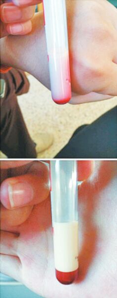 今年8月30日,何宝宝出生在郑州一家医院,出生46天左右,因呛奶引发呼吸急促,被送入郑州市儿童医院就诊。“医生让先进行血液采集,采血员惊奇地告知我们,孩子血液呈粉红色,说他们从来没有见过这样的血液,也搞不清楚是什么病症。”何女士说道。她说自己当时也很惊异,在现场,她看到,静置几分钟后,孩子被采取的血液3/4变成了乳白色,摇晃过之后还是粉色。