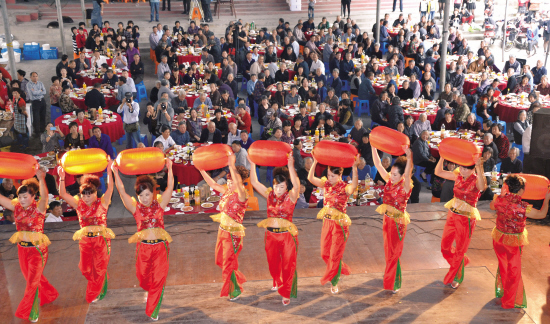 11月1日是农历闰九月初九,玉环县龙溪镇花岩浦村戏台锣鼓铿锵,歌舞飞扬,400多名老年人围坐48桌宴席前,一边欣赏乡土风味的歌舞戏曲,一边品尝村企业家献上的美酒佳肴。“一生难逢闰九月,百年一遇双重阳”,在今年第二个重阳敬老节到来之际,村里23家私营企业主捐资13万多元,开展“十佳五好老人”、“十佳孝贤子媳”表彰、举办重阳宴会活动,热热闹闹欢度百年一遇的双重阳节。