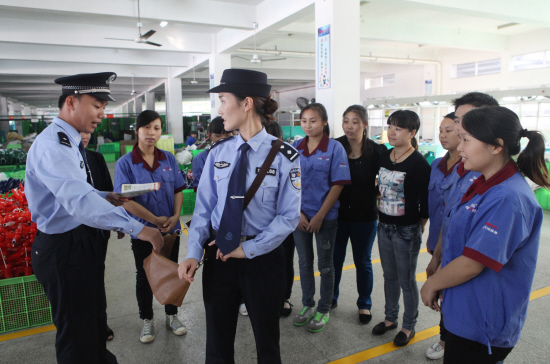 “包要这样背才不容易被抢!”10月27日,黄岩公安分局新前派出所民警来到辖区内一家工厂开展安全生产检查和安全防范知识宣传时,在女工较多的车间里,现场开展了防范抢夺和盗窃的情景教育,提高女工们的防范能力。
