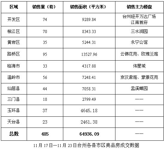 上一周(11月17日—11月23日)台州市各县市区共成交一手商品房485套,成交总面积64936.09平方米。相较于前一周(11月10日—11月16日)598套的商品房成交量,上周的成交量下降113套,跌幅为18.9%。