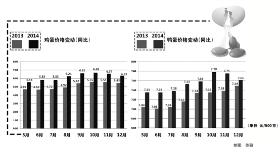 杭州市物价局相关负责人解释,目前,杭州鸡蛋价格仍处于高位运行。由于受2013年禽流感疫情影响,浙江、江苏、山东、河南等多个省份蛋鸡养殖业遭受重创,养殖户补栏动力不足。杭州建德蛋鸡养殖受禽流感疫情及“五水共治”建设的政策导向的双重影响,产蛋量较2012年减少幅度在五成左右,供给杭州市场的份额也从20%降至10%。蛋鸡存栏量明显下降,推升了今年杭州鸡蛋价格的较快上涨,市区10月上旬鸡蛋价格一度攀升至6.77元,同比上涨20.89%。