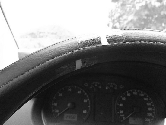 记者将方向盘套套在方向盘上,其大小刚好能与方向盘匹配。记者在方向盘套上贴上白色胶带,作为记号。在行驶过程中,记者在打方向盘时,虽然没有明显感觉到方向盘套打滑,但是方向盘套上白色胶带的位置却发生了移动。行驶1小时后,白色胶带偏离原先的位置足足有2.5厘米。由此可见,即使有防滑设计,方向盘套还是会发生打滑。