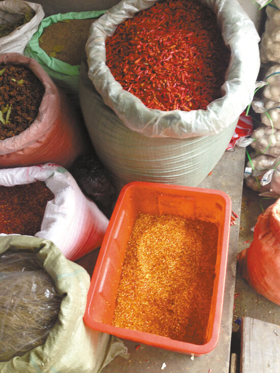 在副食品市场北侧沿街一排销售调味品的商店,记者看到了琳琅满目的各式辣椒。