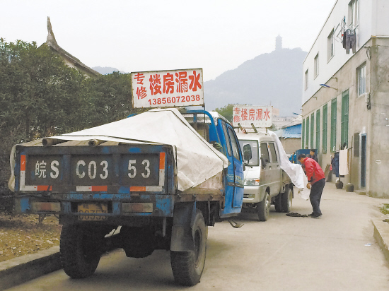 12月2日下午6点,刘克光收工回家,他把“吃饭的家伙”——一辆车顶上搭有“专修楼房漏水”广告牌的面包车,停放在位于路桥下包的出租房前,打开后备箱,归置了一下工具后,转身准备进屋。记者急忙将他叫住。
