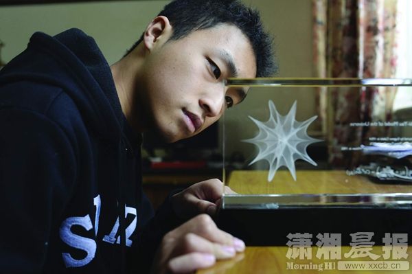 12月15日,谭泽睿看着自己获得的“丘成桐中学数学奖”金奖奖杯,他对奖杯里的卡拉比模型非常感兴趣。图/潇湘晨报记者辜鹏博