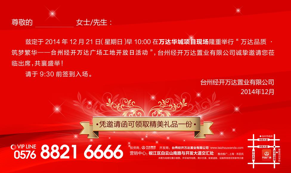 此外,凭借邀请函前来参观的客户还可获得由万达广场提供的精美礼品一份。请广大业主和客户朋友及时联系你的置业顾问领取邀请函,数量有限,先到先得,送完即止!
