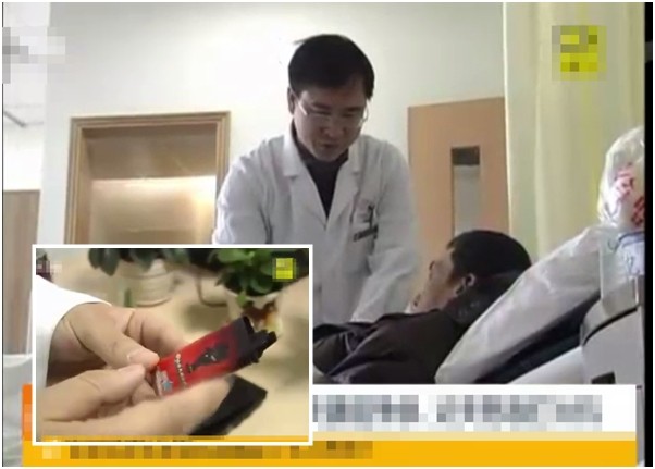 郑先生为证明自己戒烟的决心,竟吞下打火机(小图)。(电视画面)