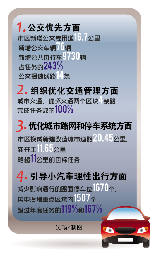 在优先发展公共交通上,市区新增公交车专用道16.7公里、公交车76辆。此外,新增公共自行车9730辆,共完成公交提速线路14条。