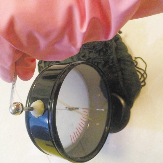 记者用玻璃棒代替人体皮肤,分别将不同材质的棒子与测试物品进行摩擦,模拟人体产生的静电,观察仪器产生的数值,获得实验数据。为了更准确地获得真实数据,记者戴上绝缘塑胶手套进行实验。