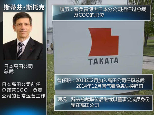 斯蒂芬·斯托克在上世纪80年代就读于日本东京工业大学,从此与日本结下不解之缘。而其正式加入高田公司则是2013年2月,富有戏剧性的是其此前就任的总裁职位正是接替高田茂久,其也成为第一位担任高田总裁职位的外籍人士。而加入高田公司前其曾任职于博世日本分公司担任过COO及总裁的职位。高田公司也表示,由董事长高田茂久在次兼任总裁职位正是为了解决安全气囊隐患造成的影响。