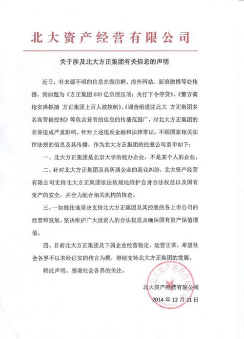12月21日,方正集团官方网站发布《北京大学关于涉及北大方正集团有关信息的声明》,就网上流传的《警方荷枪实弹抓捕 方正集团上百人被控制》等信息进行情况说明,称其“危言耸听”,“违反金融和法律常识”。