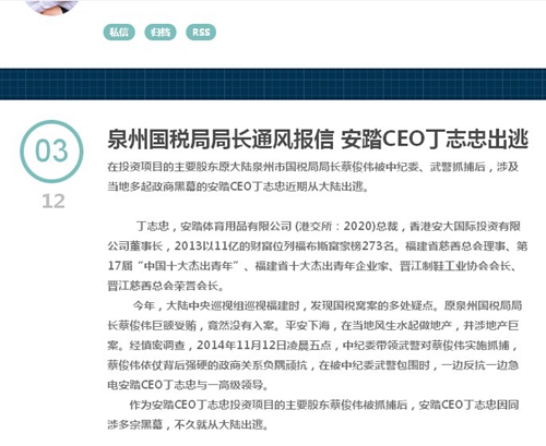 2014年12月初,有报道称“泉州国税局局长通风报信,安踏CEO丁世忠出逃”。