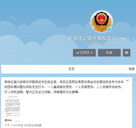 石家庄公安局12月15日回应称,12月14日19时30分许,石家庄市公安局指挥中心接群众报警,桥西区红旗大街与新石中路交口附近有人被枪击伤,打人者已经逃跑。