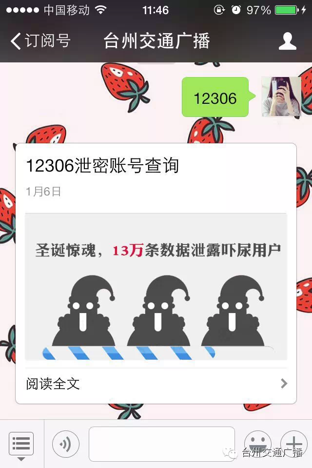 2014年12月25日,一网友在国内知名漏洞报告平台乌云上发表了一篇题为《大量12306用户数据在互联网疯传包括用户账号、明文密码、身份证邮箱等(泄露途径目前未知)》的帖子,称当前有黑客获取了12306的所有用户信息并在一些黑客群体中进行流传、买卖,而泄露的个人信息包括用户账号、明文密码、身份证、邮箱,涉及共计131653名用户。