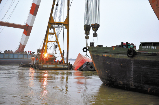 记者在现场看到,下午江水退去了一点,“皖神舟67”被拖向岸边,在离岸一二百米处,船体已经浮出水面五六米,还有几艘搜救船围绕着沉船巡护。近24个小时的抢救打捞结果表明,指挥部最终选择了边靠岸边清理搜救的处置方案。现场救援专家认为,这也是最大限度挽救幸存者的一种保守的打捞方式。