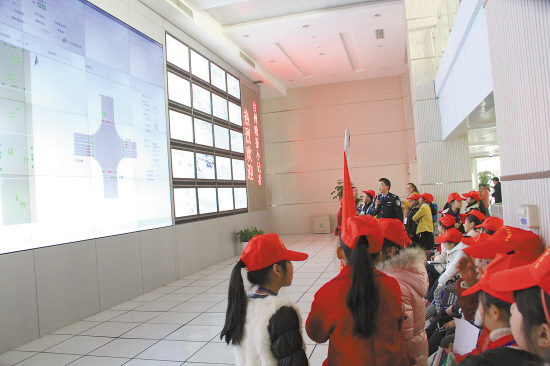 1月23日,来自温岭三星小学、岩下小学、城东小学的51名台州晚报小记者,来到温岭交警大队参加采风活动。图为小记者们正在参观交警指挥中心。通讯员陈明方摄