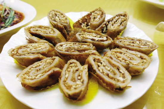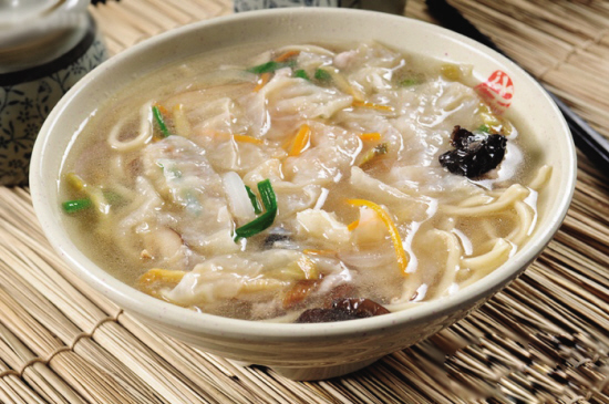 身为沿海城市的台州人,最擅长利用海鲜制作各种食品。敲鱼面是玉环的特色小吃,就是将鲜鱼(最好是海鲜鳗)剔出净肉,撒上薯粉,然后再用木槌敲击,敲至发韧,像一张薄饼,然后放在锅里烤至半熟,取出切丝就成鱼面了。经如此工序制成的鱼面,存放一年半载都不会坏。