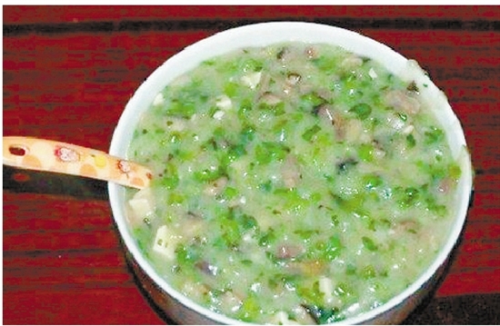 大年十四傍晚,临海家家户户飘出糟羹的咸香味。一碗跟藕粉颜色近似的糟羹,摆在餐桌上,其内容却异常丰富——青色的芥菜叶,黑色的香菇丁,香喷喷的肉丁,爽口的白色荸荠丁,绵软的芋头丁……用筷子在碗里划拨,一碗糟羹很快被孩子们呼哧呼哧喝完。