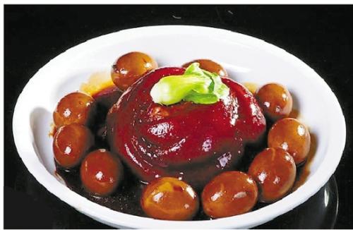 这红烧肉元宝蛋的做法还是有窍门的,得把五花肉先煸炒出猪油,使成品的肥肉不油腻,瘦肉更有咬劲,加少许高度白酒可以去腥提鲜。剥好的熟鸡蛋要先用少许油煎一下,外皮褶皱才好吸收汤汁,要不断转锅以免煎糊。最后收汁要先把鸡蛋挑出来,以免最后翻炒破鸡蛋。