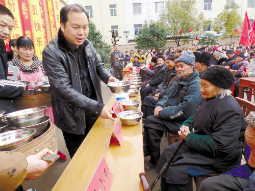 礼堂边上,厨房里热气腾腾,大蒸笼冒着白雾,香气四溢,上千个肉包子正待出笼。为了这上千个孝敬老人的包子,村民单庆炉等人已经忙了两天,初五就开始和粉、揉面、剁馅,做好准备工作。当天上午,村里分20个小队,每队选出两名“巧妇”大比拼,掐出的一个个肉包子,和红包一起,送到每位老人手中。村民单玲飞端着一屉蒸笼说,相比到饭店去摆酒吃饭,自己动手做馒头更有味道,更有过年的感觉。