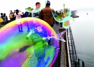 7岁的小游客在西湖断桥上玩泡泡。过年期间,国内各大知名景区人员爆棚。