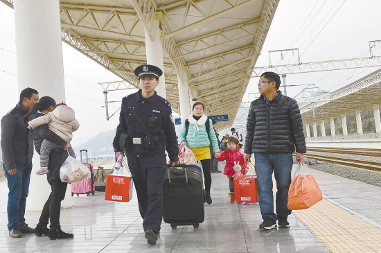 ▲2月24日,春节长假最后一天,三门县火车站也迎来旅客返程高峰。该县公安局亭旁派出所和三门火车站警务室民警在疏导旅客、宣传返程安全知识的同时,帮助旅客解决上车中遇到的困难。图为当天上午,执勤民警帮行李多的返程旅客拎行李。