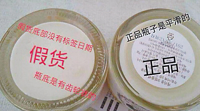 3.看内瓶底细节。先说日期的印刷,正品韩国马油霜类似于油印,目测有颗粒感,用指甲是刮不掉,对比之下假货的字体边缘精细,没有颗粒感,用力抠会连纸带墨被抠起来;再说瓶底边缘做工,正品并不透彻,但是相当光滑,而假货的瓶子玻璃其实比正品的还要通透;再来看瓶底的标签印刷对比,正品清晰细致,偏向深色玫红,对比之下假货明显偏黄。